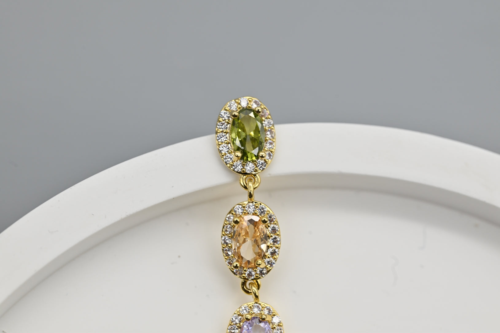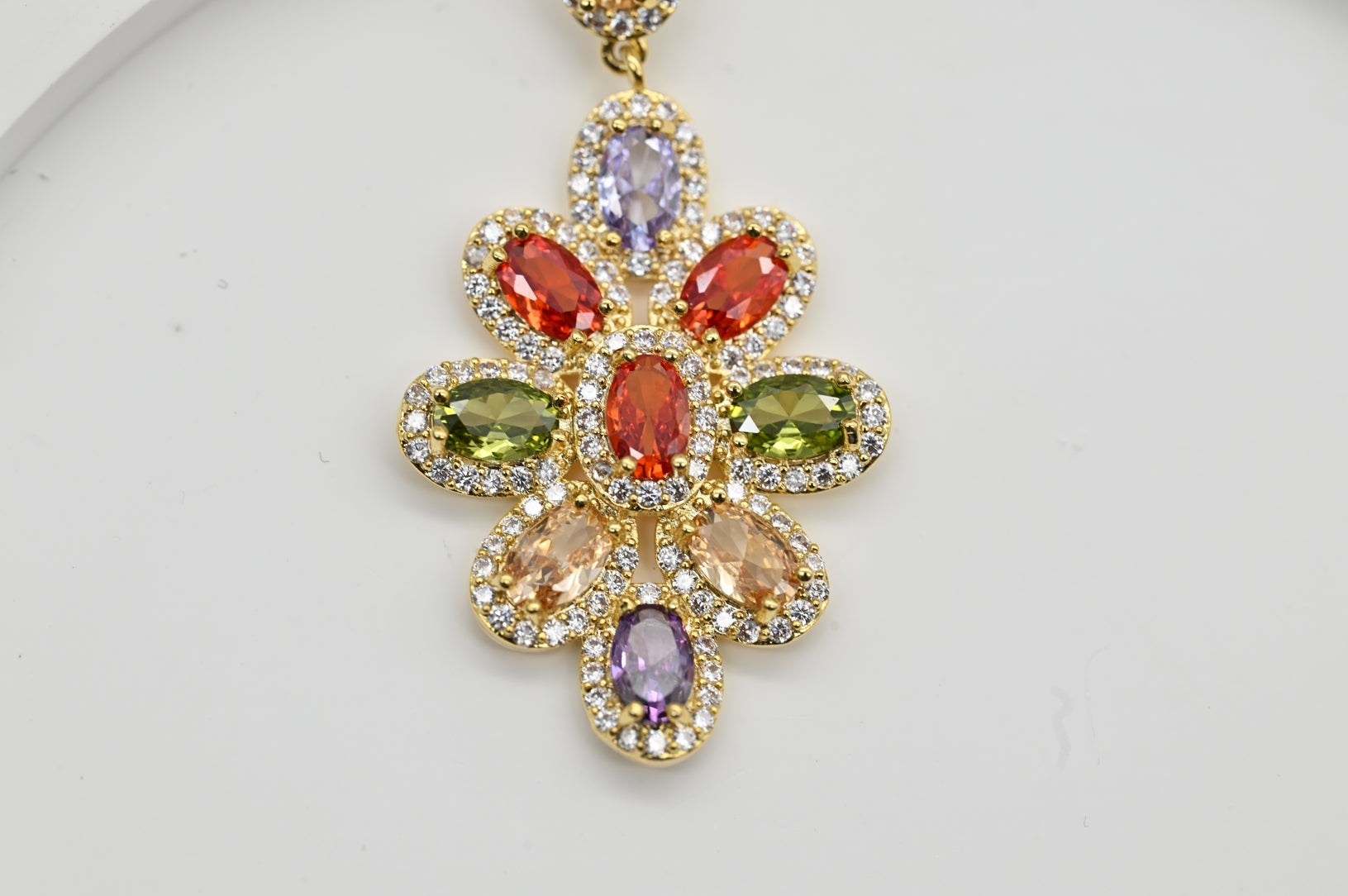 These stunning earrings feature a vibrant floral design composed of multicolored gemstones set in gold. Each petal sparkles with a different hue, creating a dazzling and eye-catching accessory perfect for adding a pop of color and elegance to any ensemble.