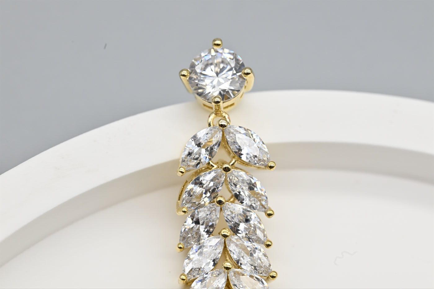 Exquisite Design: Featuring a vibrant emerald-green centerpiece, each earring is encircled by a halo of sparkling cubic zirconia. The elegant drop design is adorned with marquise-cut cubic zirconia that cascade gracefully, exuding timeless sophistication.