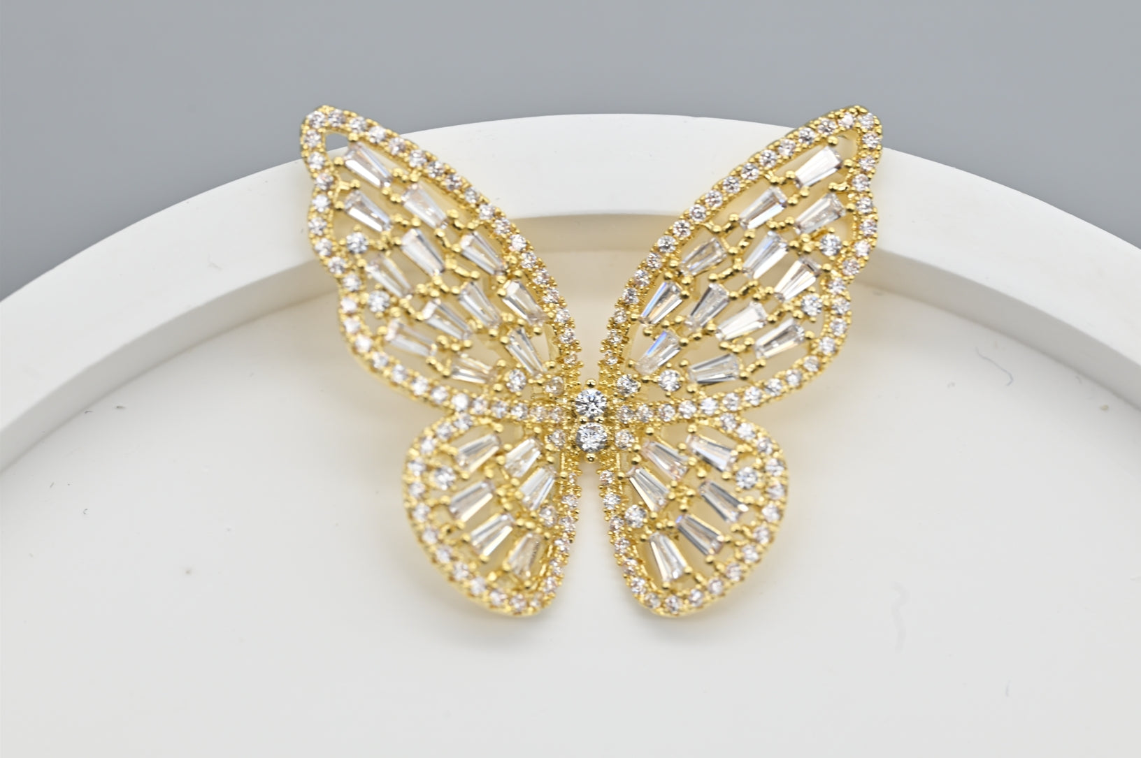 These exquisite butterfly earrings feature delicate wings adorned with clear crystals set in a luxurious gold frame. The intricate design and sparkling stones create a sophisticated and enchanting accessory, perfect for adding a touch of elegance and glamour to any outfit.