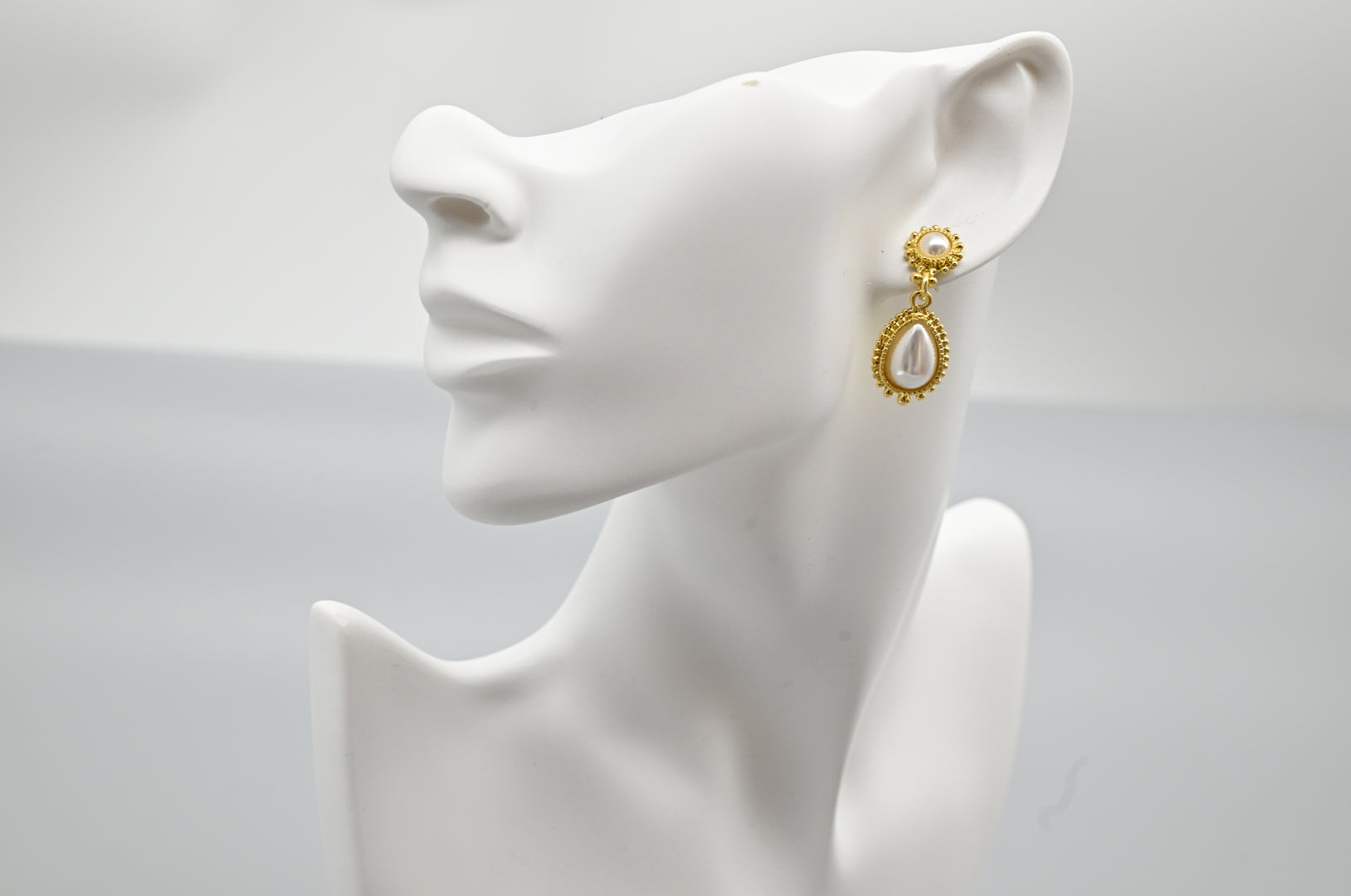 These elegant earrings feature lustrous pearls set in a teardrop shape, surrounded by intricate gold detailing. The combination of the classic pearl and ornate gold design creates a sophisticated and timeless accessory, perfect for adding a touch of elegance to any outfit.