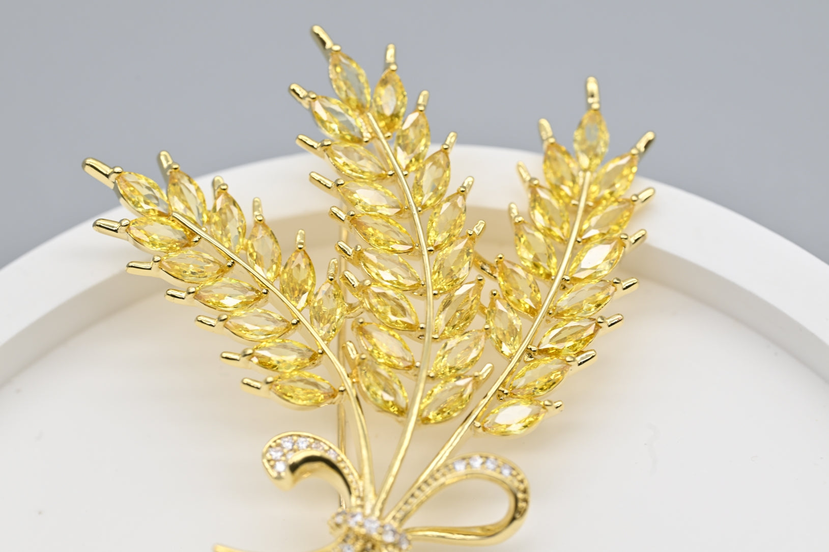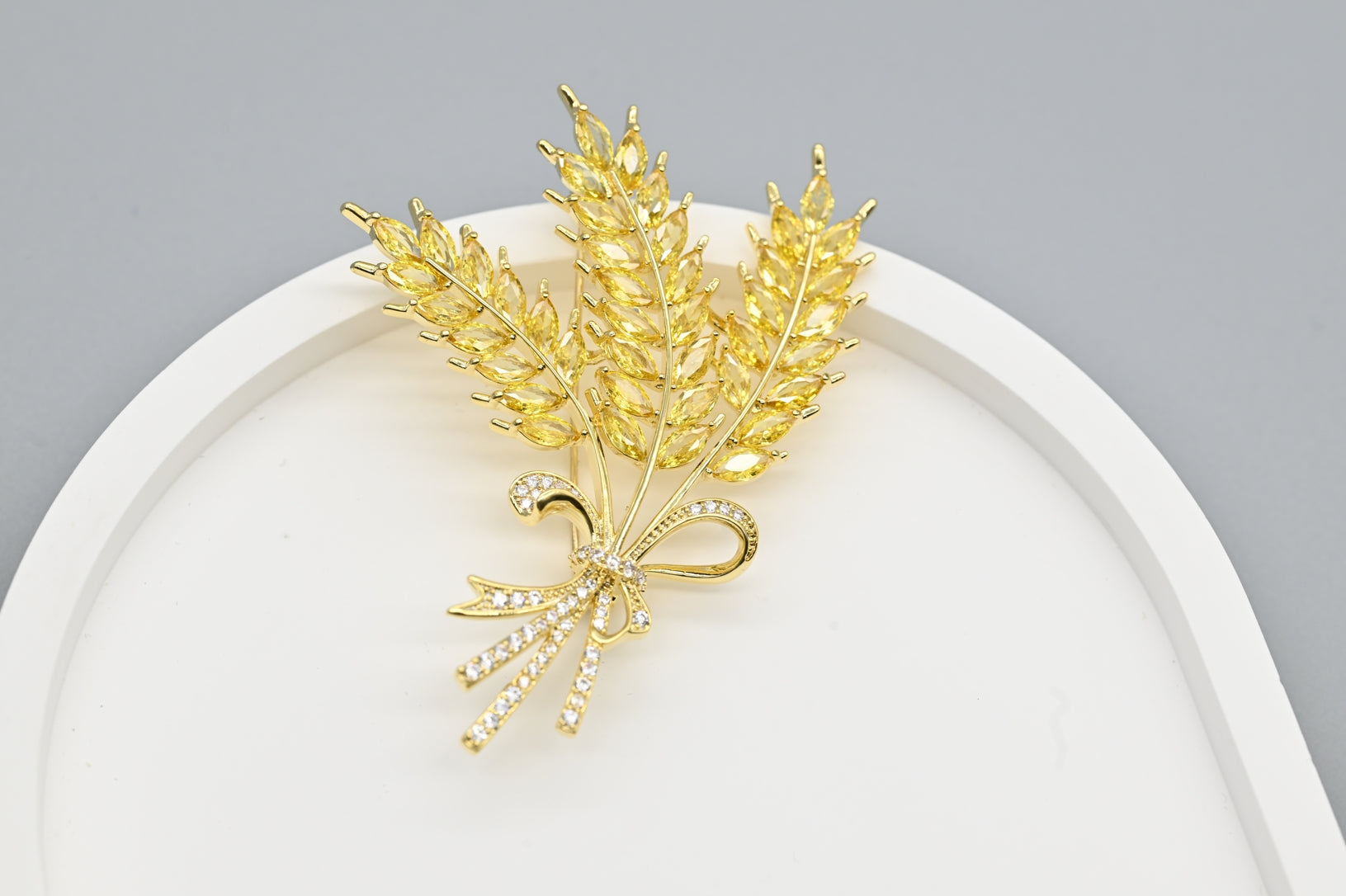 This elegant brooch features a beautifully crafted gold wheat sheaf, adorned with sparkling crystal accents. The intricate design and shimmering stones create a sophisticated and timeless accessory, perfect for adding a touch of nature-inspired elegance to any outfit.