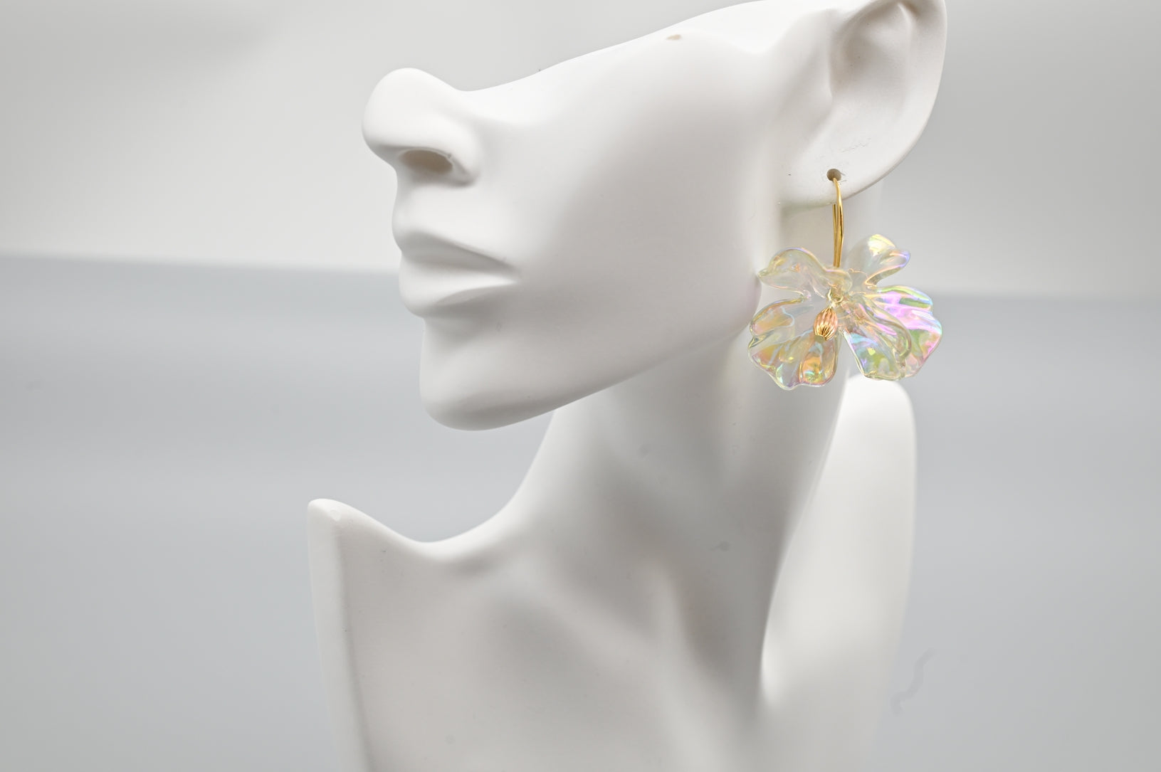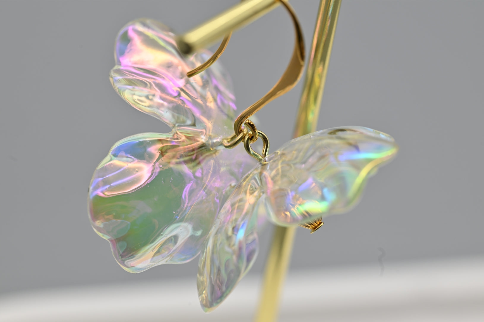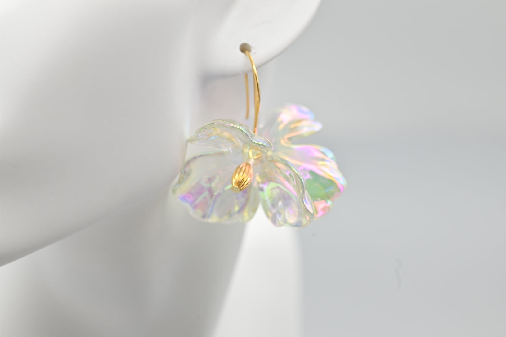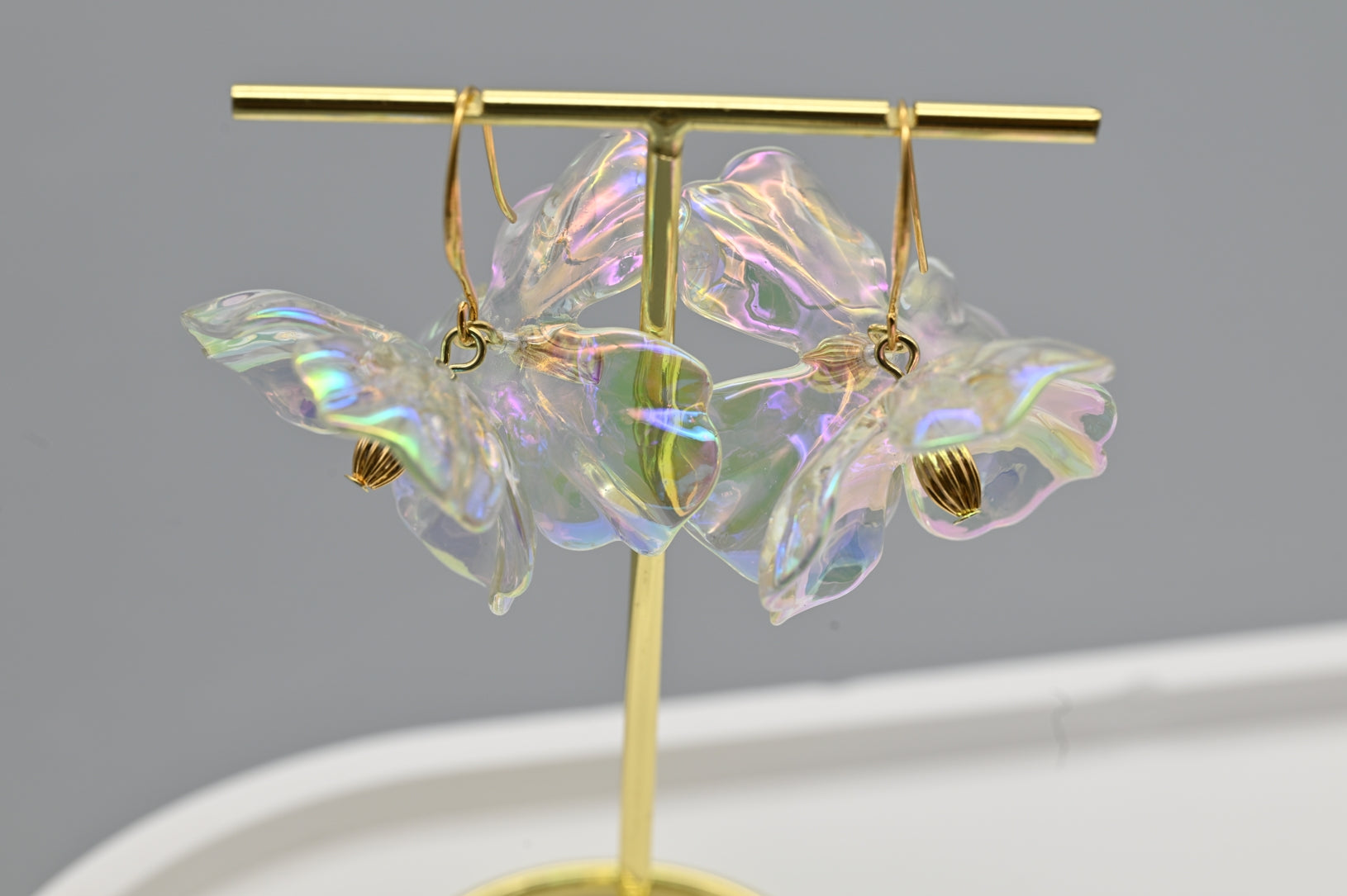 These enchanting earrings feature delicate, iridescent flower petals that shimmer with a spectrum of colors. Suspended from elegant gold hooks, they create a whimsical and ethereal look, perfect for adding a touch of magic and elegance to any ensemble.