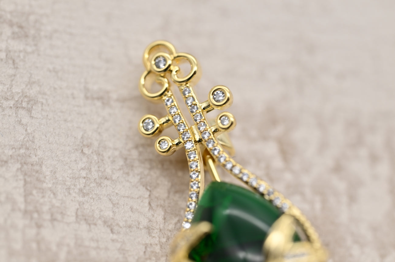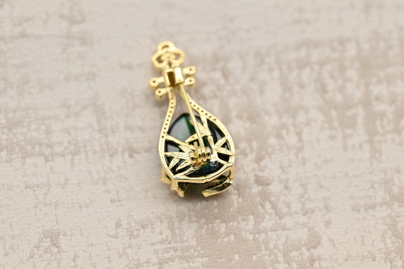 The brooch features a large, radiant green gem that serves as the focal point. This gem is encased in a delicate gold-tone setting, adorned with intricate floral accents. The leaves and stems are embellished with sparkling crystals, adding a subtle yet sophisticated shine. The top of the brooch is designed with an ornate, vintage-inspired pattern that enhances its antique appeal.